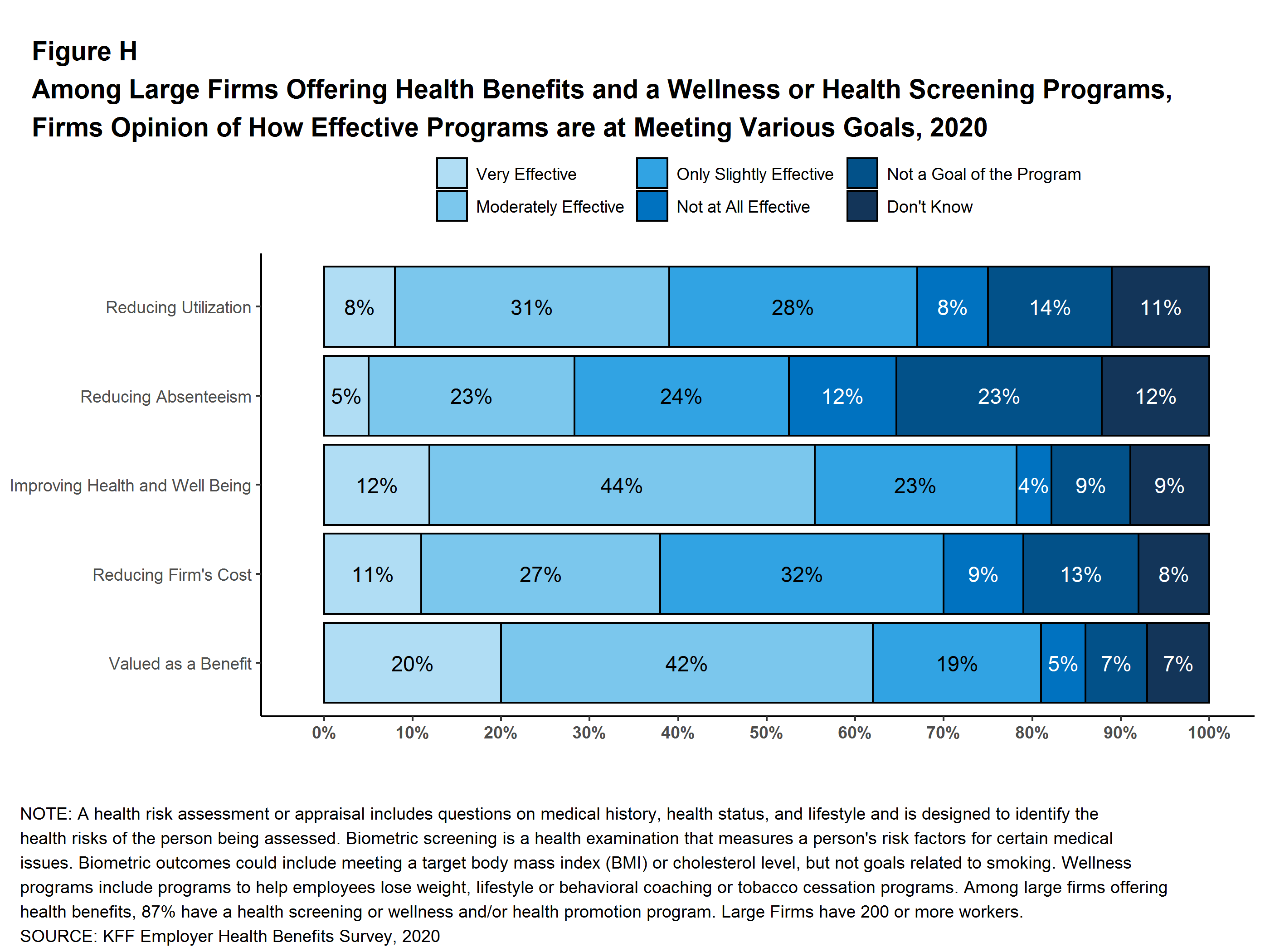 This same study by the Kaiser Family Foundation also found that in terms of effectiveness, 62% of firms found the programs moderately or very effective in terms of being valued as a benefit, while 56% found the programs moderately or very effective for improving health and well-being among participants.
